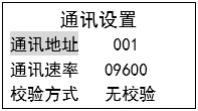 該功能設(shè)置控制裝置通訊參數(shù), 以便上位機可與其進行數(shù)據(jù)通訊, 包含設(shè)備通訊地址(1~255)、通訊波特率(2400、4800、9600、19200)、校驗方式(奇校驗、偶校驗、無校驗) 設(shè)置。注意: 在同一個 RS485 網(wǎng)絡(luò)中設(shè)備通訊地址不能重復(fù)。用戶按“SET”鍵使相應(yīng)數(shù)值進入修改狀態(tài), 在此狀態(tài)下, 通過